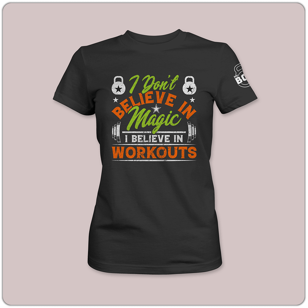 CAMISETA FEMININA BABY LOOK - I DON'T BELIEVE IN MAGIC, I BELIEVE IN WORKOUTS